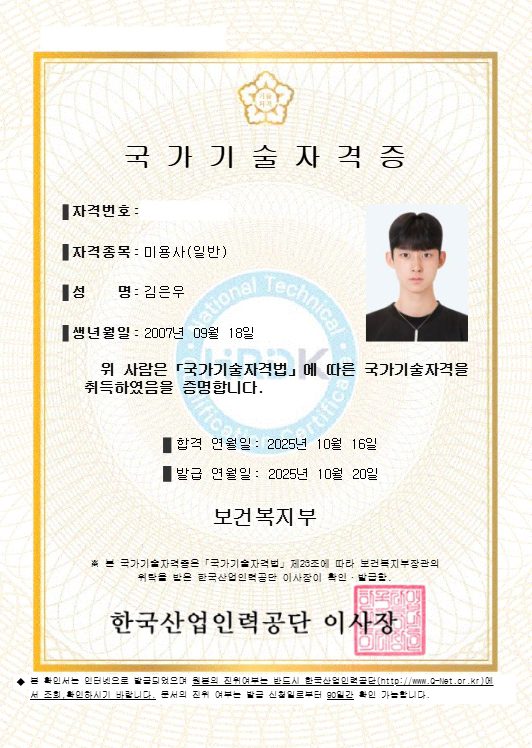 안녕하세요~ 저는 이번에 미용사(메이크업) 국가자격증에 합격한 고등학교 3학년 김은우입니다.